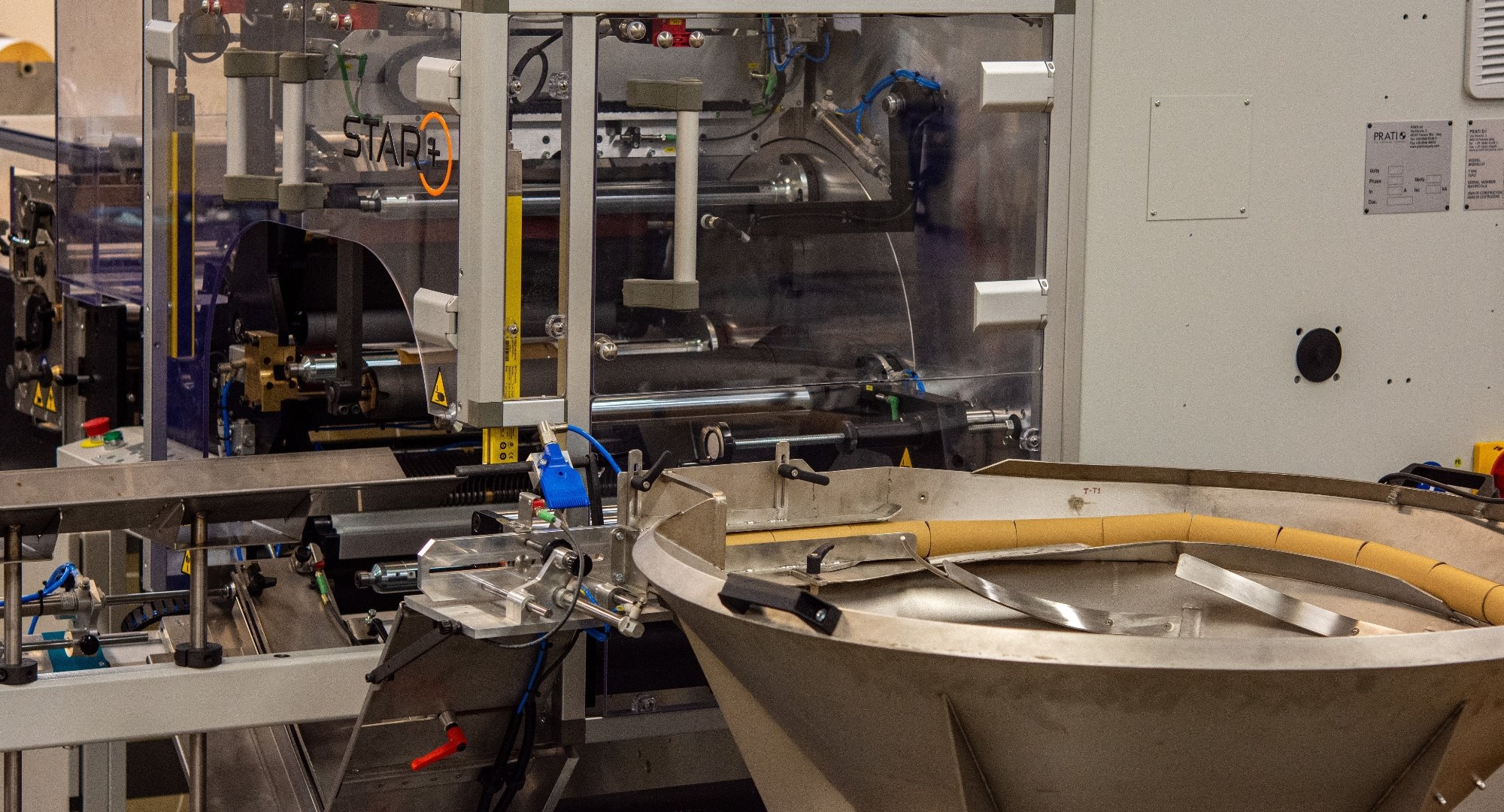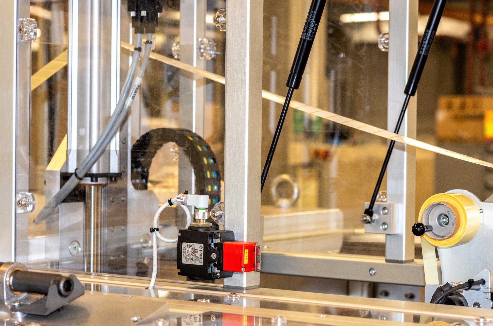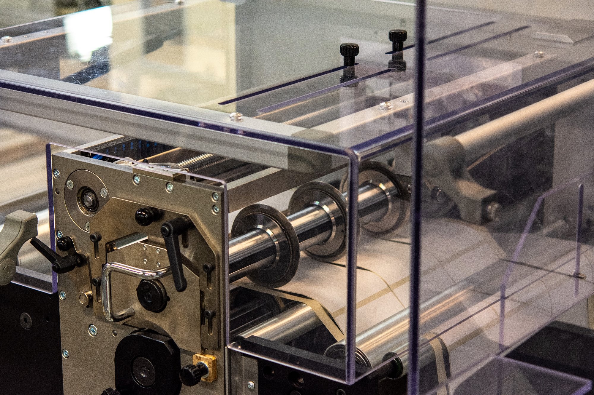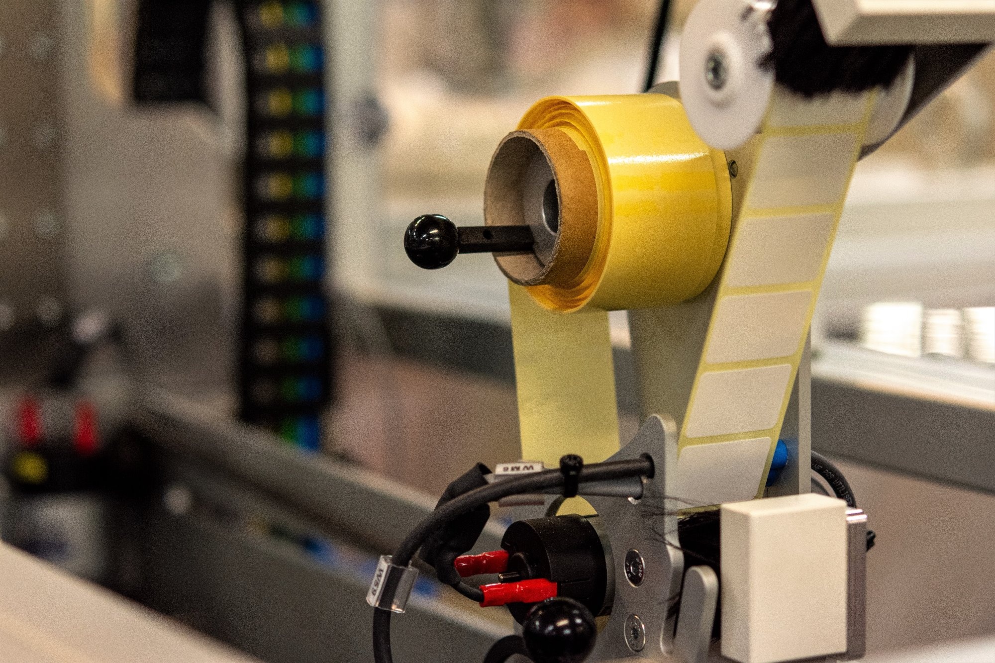 Součástí zařízení je i termotiskárna, která slouží k automatickému potisku přelepek pro uzavření hotových kotoučů dle individuálních požadavků zákazníka.