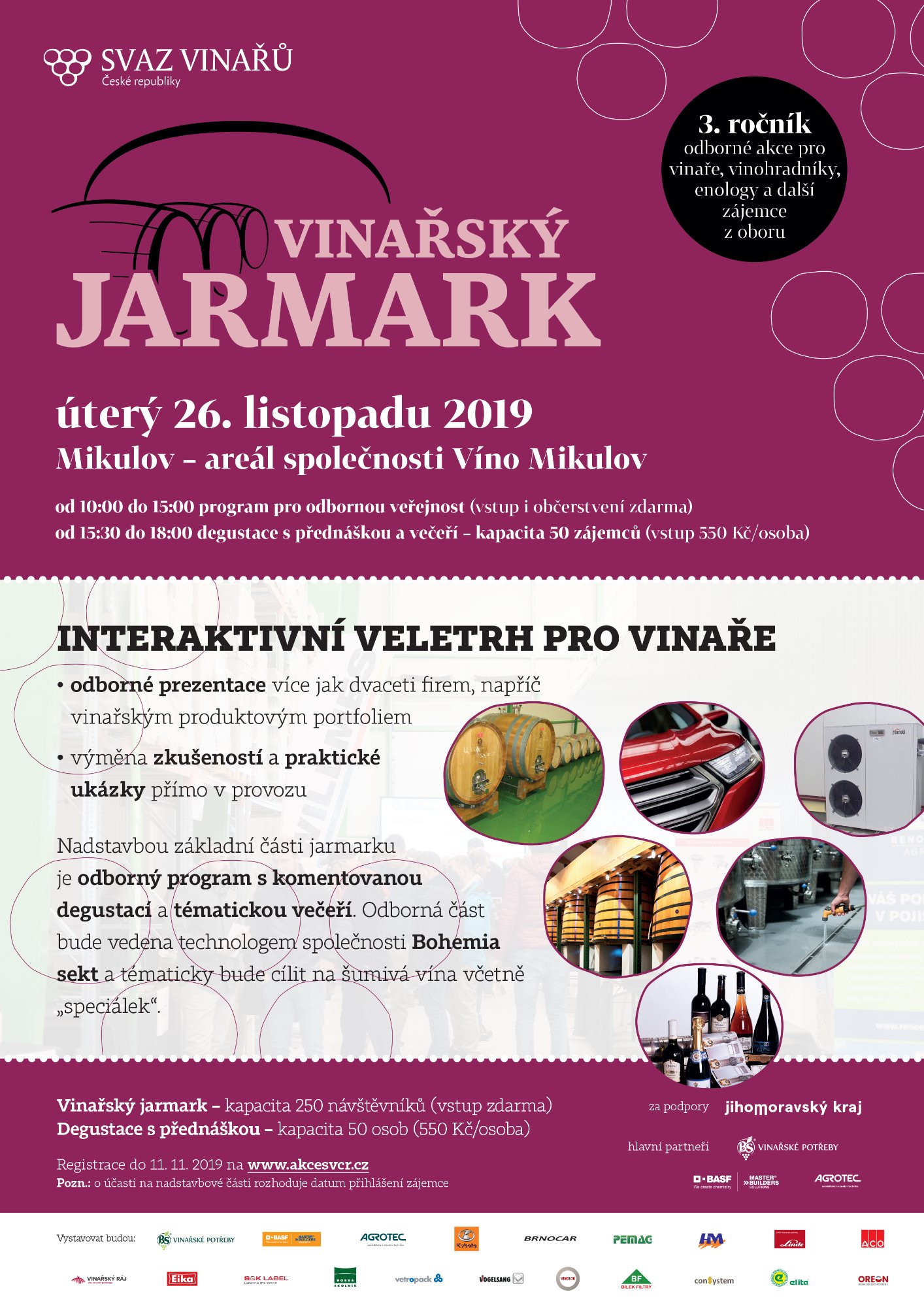 Srdečně Vás zveme na třetí ročník odborné akce pro vinaře, vinohradníky, enology a další zájemce z oboru VINAŘSKÝ JARMARK 2019, která se uskuteční 26. 11. 2019 od 10:00 hod. v areálu společnosti Víno Mikulov.